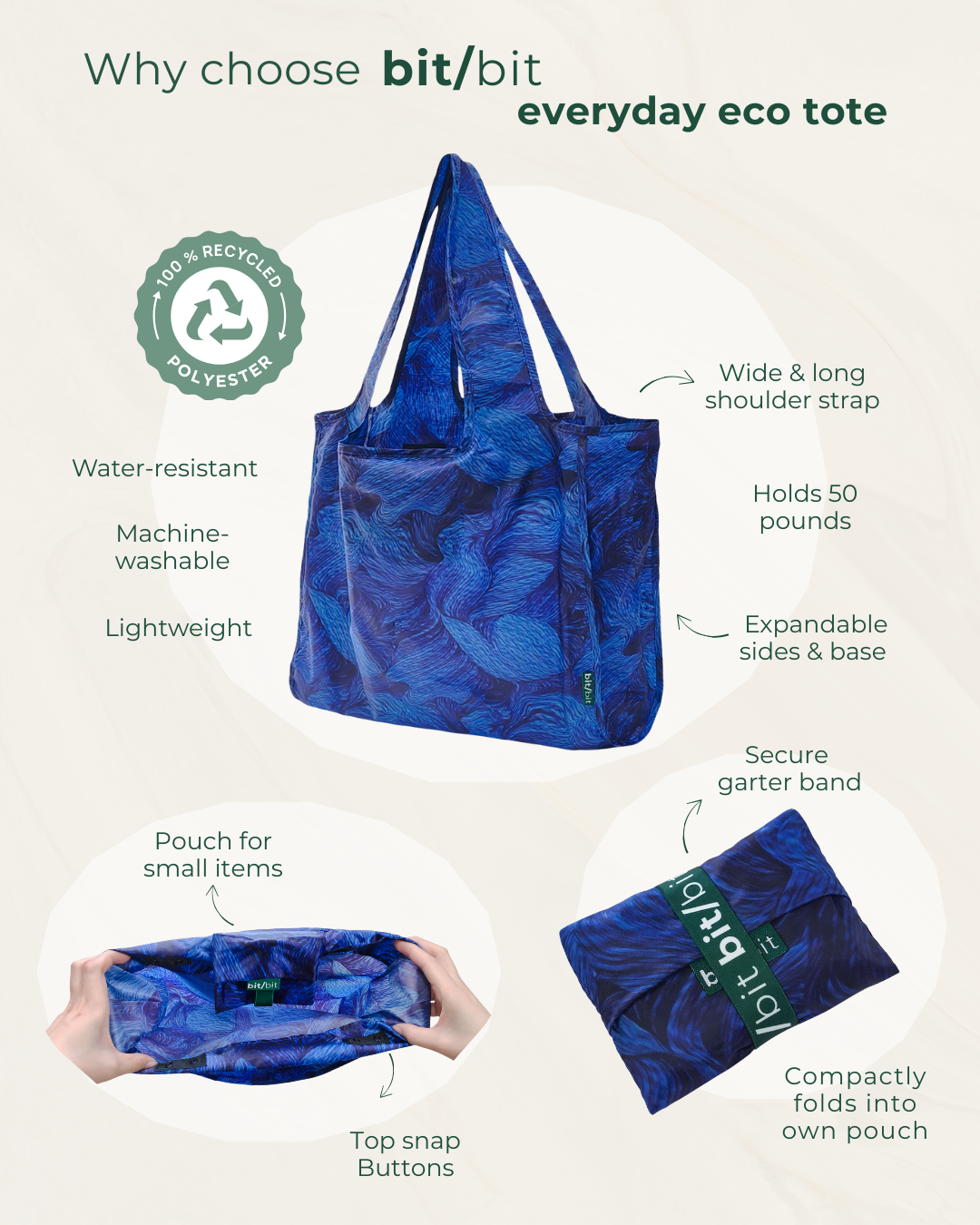 Life is loaded enough. Let’s help you lighten that a bit with our bit/bit Everyday Eco Tote. A simple solution that gets you organised whilst providing a kind gesture to our dear earth.